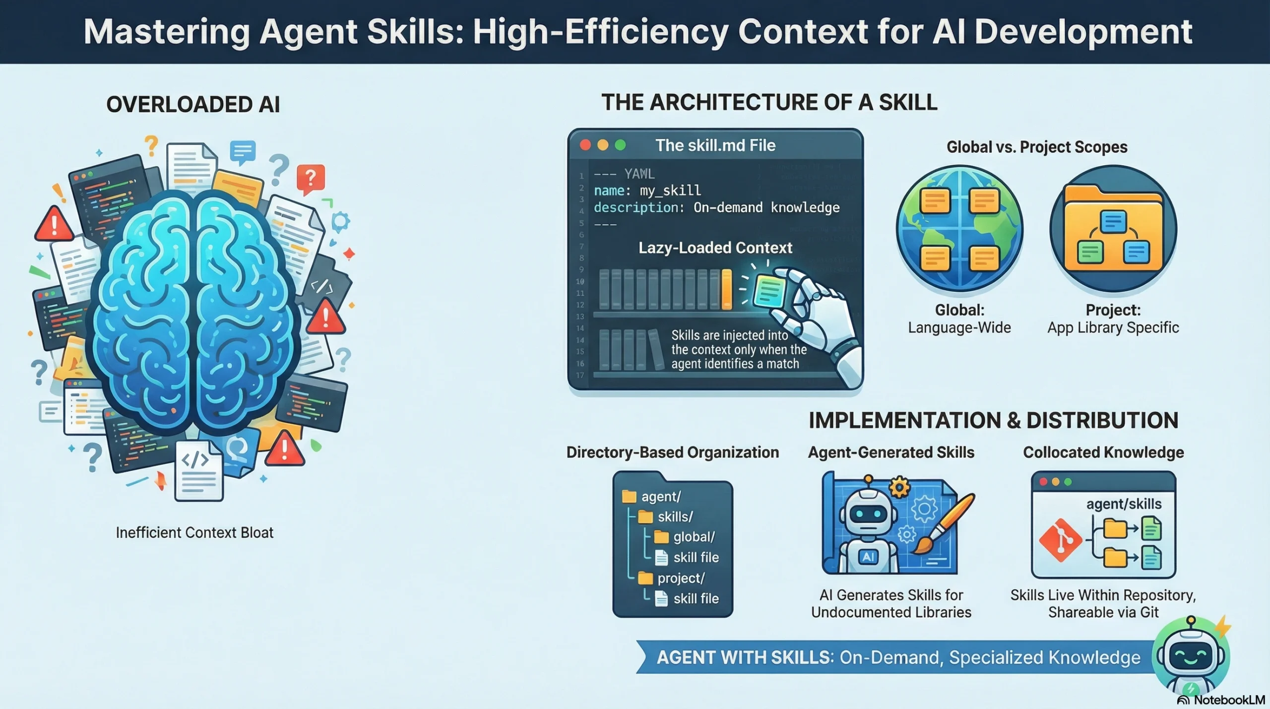 Pada intinya, sebuah “skill” hanyalah sebuah file skill.md yang terletak di dalam folder khusus dalam direktori agent skills (lokal maupun global). File Markdown ini berisi metadata YAML dengan nama dan deskripsi yang membantu AI menentukan apakah instruksi tersebut layak dibaca untuk mencapai tujuannya saat itu.