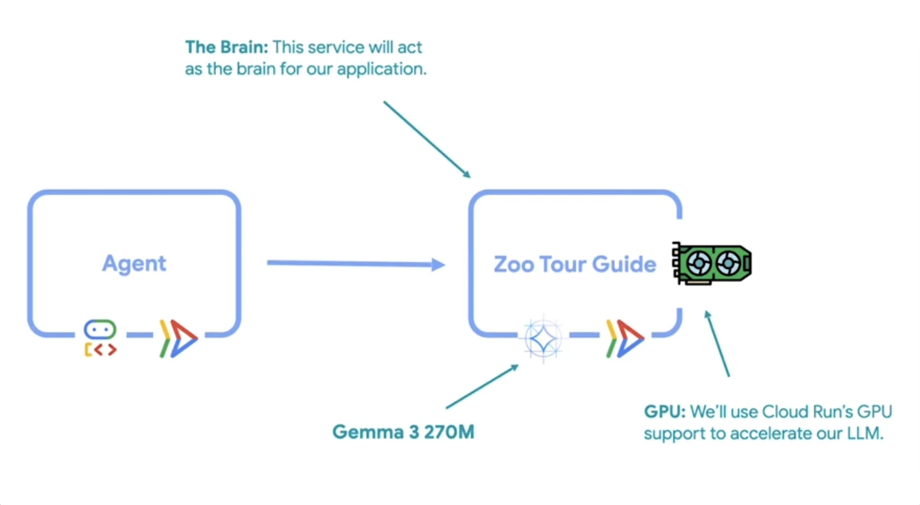 Kamu mungkin bertanya-tanya kenapa kita tidak pakai model yang sudah ada dan siap pakai saja untuk AI agents kita. Melakukan deploy Large Language Model (LLM) secara decoupled memungkinkan kamu untuk men-scale-nya secara mandiri dan melakukan fine-tune untuk tugas-tugas yang sangat spesifik. Misalnya, kamu bisa men-fine-tune sebuah model agar menjadi pemandu wisata kebun binatang spesialis yang bisa menjawab pertanyaan apa pun tentang hewan-hewan di sana! Karena model ini akan menggunakan GPU resources—yang sedikit lebih mahal dari CPU resources—men-scale komponen ini secara terpisah adalah langkah yang cerdas dan hemat biaya.