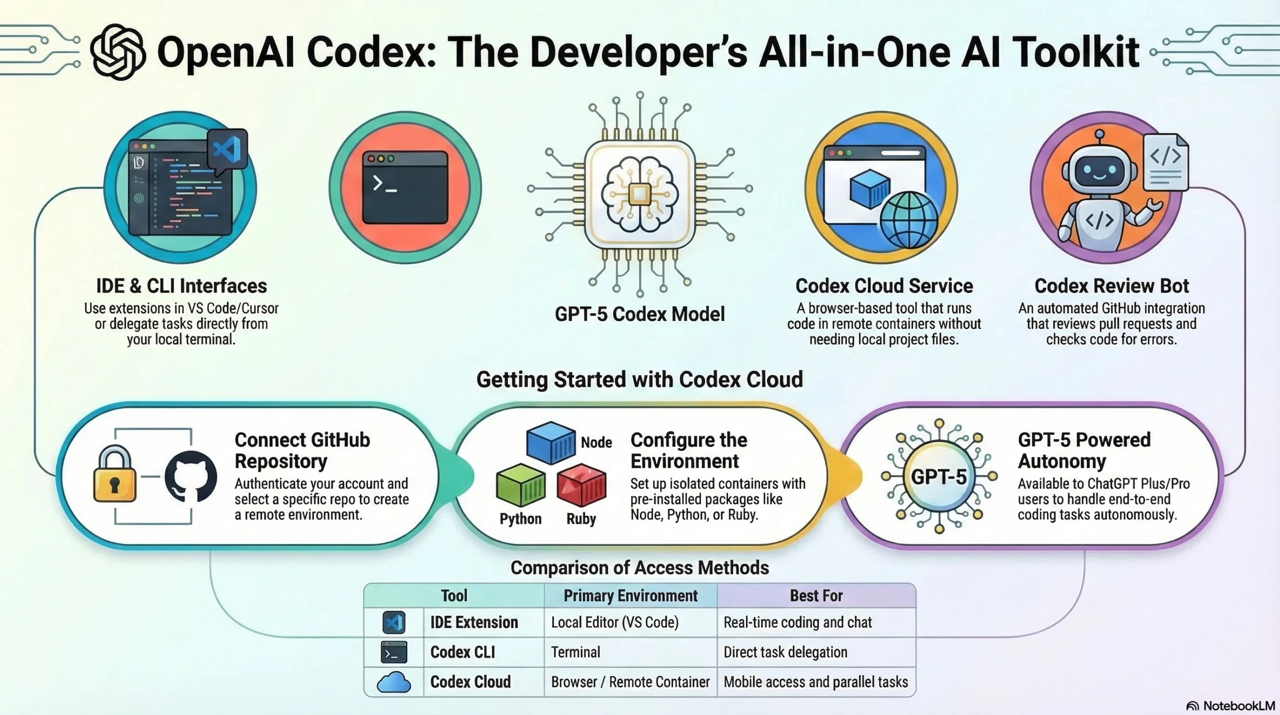 - Codex Cloud Service: Tool berbasis browser yang terhubung langsung ke GitHub repository. Ia akan menjalankan isolated remote containers untuk mengeksekusi kode dan melakukan perubahan, yang nantinya akan membuka pull request (PR) di repo kamu. Artinya, kamu bisa memulai tugas dari perangkat apa pun tanpa perlu melakukan clone project secara lokal.